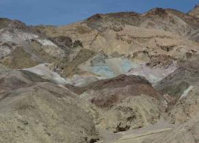 | Artist's Drive is a scenic loop through a deep canyon cut into the Black Mountains. Above, the Artist's Palette is especially beautiful and is noted for having various colors of rock caused by the oxidation of different metals within it. Red, pink and yellow is from iron salts, green is from decomposing tuff-derived mica, and manganese produces the purple. |