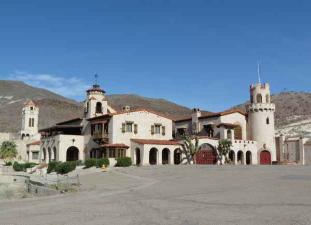 | Prospector Walter Scott aka “Death Valley Scotty”, claimed this elaborate Spanish Colonial Revival style villa located in the Grapevine Mountains of northern Death Valley was built with the gold from his fictitious mine. In actuality, it was built in 1922 by his millionaire friends, the Johnsons. The villa is now part of the national park and maintained by the park service. Scotty was buried on the property at the top of the hill overlooking his castle. |