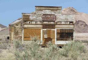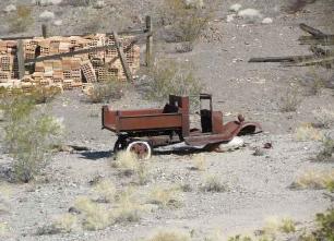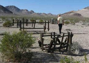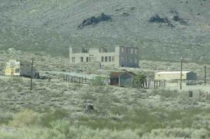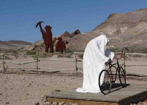 | Just outside of Beatty, Nevada is Death Valley's largest ghost town, Rhyolite. We decided to visit and since we were all alone, it really was a bit "ghostly". Established in 1905 after prospectors discovered gold, the town once had a population estimated ~10,000. By 1920, after several financial crises, the population had decreased to 14. There's not much roaming around to be done as the US Parks Service has cordoned off many of the buildings which are dilapidated...not to mention several signs with rattlesnake warnings. We did wander around in the lonesome, parched cemetery. Off the side of the road nearby, were several large sculptures just kind of sitting out in the desert. They are part of the Goldwell Open-Air Museum and were quite off the wall. |